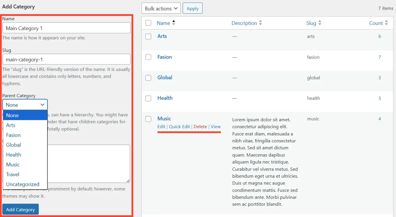 새 카테고리는 왼쪽 창 위부터 카테고리 Name과 Slug(도메인 뒤 url 주소), Parent 상위 옵션을 설정하면 된다.