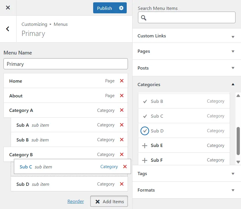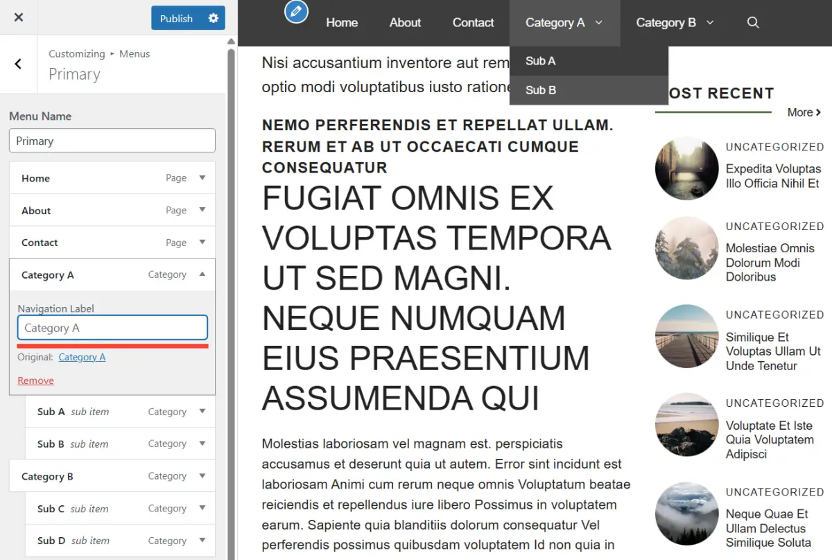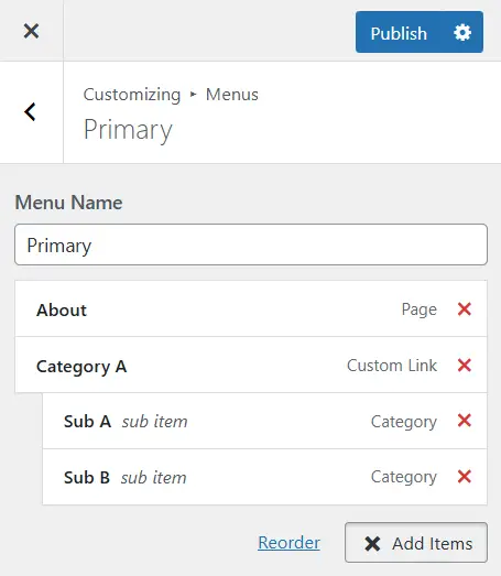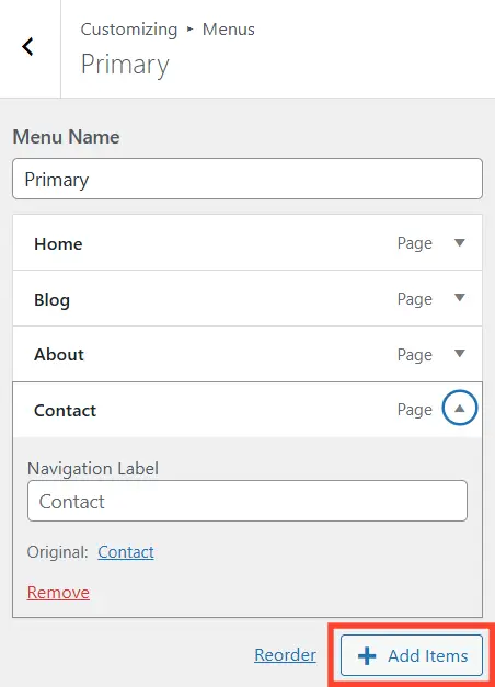 대시보드 – Appearance – Customize – Menus – Primary
