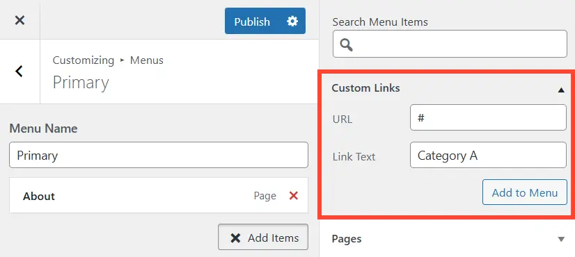 이럴 때는 이름만 있고 실제 페이지 연결이 되지 않은 가짜 메뉴(카테고리)를 만들면 된다. 우선 Add Items 버튼 클릭 후 맨 위의 Custom Links 창에 URL 란에 #과 원하는 이름을 넣은 뒤 Add to Menu를 하자.