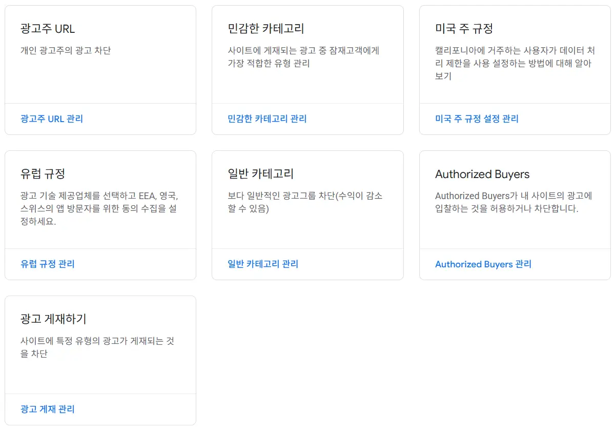 예로 민감한 카테고리에는 위와 같은 목록이 있다. 목록별 광고 노출과 수입 비중을 볼 수 있고 허용/차단은 버튼을 클릭해서 설정하면 된다.
