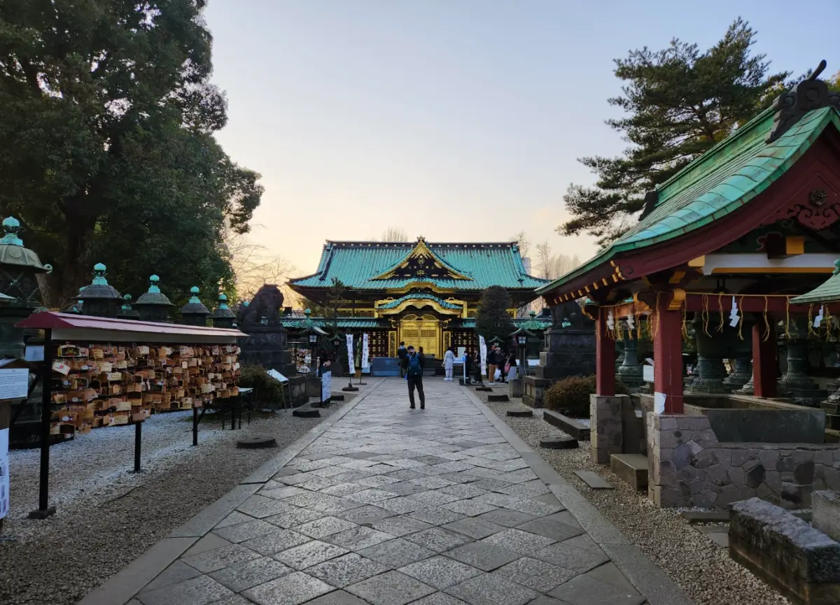 신사를 따라 내려오면 우에노 동조궁(上野東照宮 도쇼-구)이 나오는데 이곳은 에도시대를 연 쇼군 도쿠가와 이에야스를 신으로 모시고 있다. 황금색의 화려한 건물 외관이 특징인데, 일본의 다른 신사처럼 손을 씻는 테미즈야(手水舎)나 나무판에 소원을 적어 매다는 에마(絵馬), 운세를 보는 오미쿠지(おみくじ)도 찾아볼 수 있다.