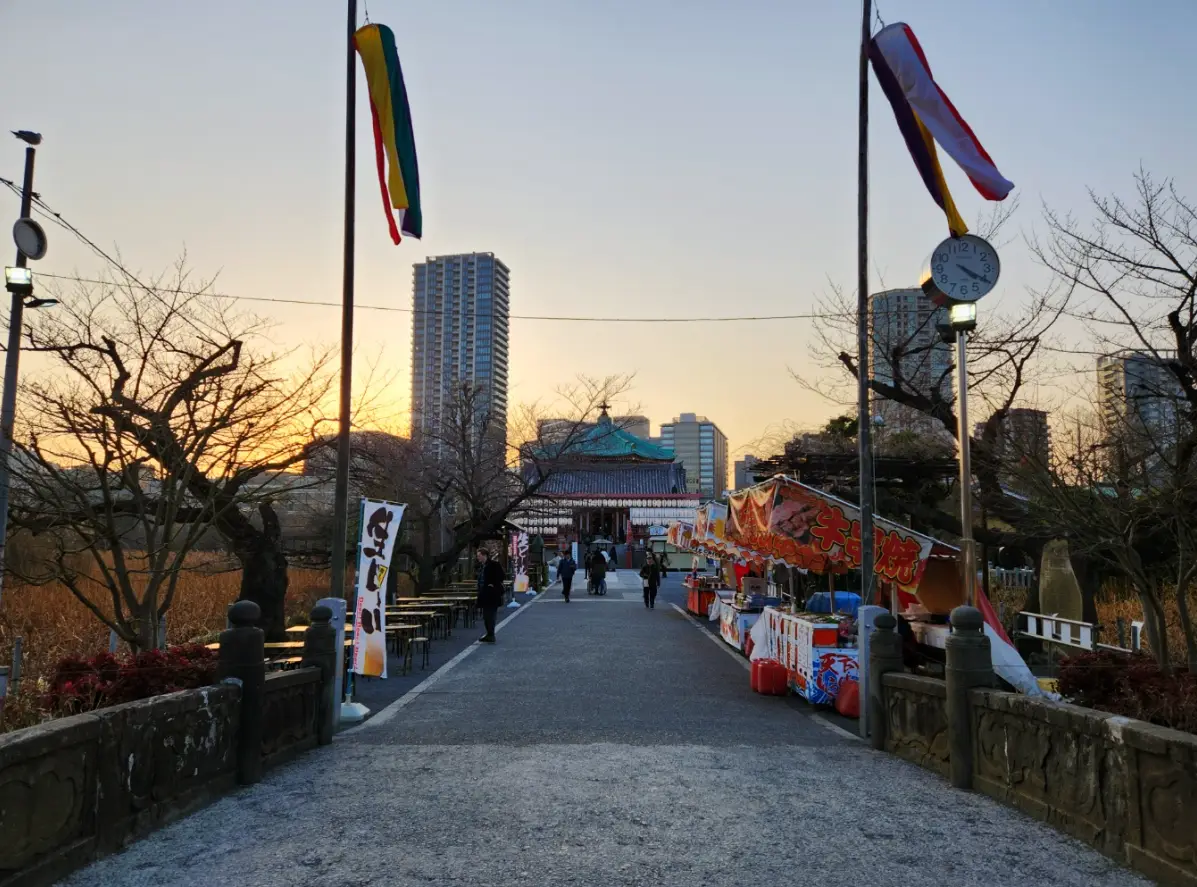 호수를 가로지르면 중앙 인공 섬에 팔각 지붕이 있는 벤텐도(弁天堂) 사찰이 나온다. 이곳에서는 행운과 재물운을 기원한다고 하는데 사찰까지 이어진 길에서 음식 노점도 발견할 수 있다.