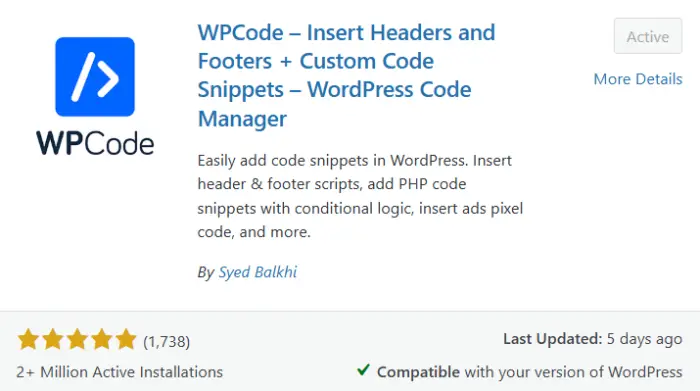 대신 Header, Body, Footer 영역이 있는 플러그인을 사용하면 PHP 편집 위험 부담을 줄일 수 있다. 이 블로그에는 WPCode를 적용 중인데 사용자 리뷰와 활성화 사이트 숫자가 많고 이용도 무료 버전이면 충분하다. 코드 입력이나 관리도 편하고 비용도 없어서 플러그인을 사용은 추천할 만하다.