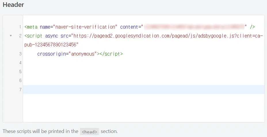 이후 Header, Body, Footer 영역에 필요한 코드를 추가하면 된다. 이 블로그는 Header 영역에 네이버 서치어드바이저와 애드센스 코드만 추가했는데, 워드프레스 운영 방향에 따라 필요한 영역에 코드를 추가하고 Save Change 버튼을 클릭하면 적용된다.