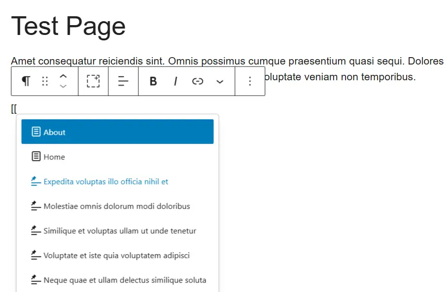 대시보드 – Pages – Add Page 버튼을 누르면 페이지 생성 화면으로 올 수 있다. 원하는 제목과 설명 등을 적었다면 본문 영역 빈 곳에(Type / to choose a block) 왼쪽 대괄호 두 개 [[ 입력 후 원하는 글 제목을 선택하면 된다. (제목은 링크 안에서 수정하고 불필요한 글자를 지워도 링크가 유지된다)
