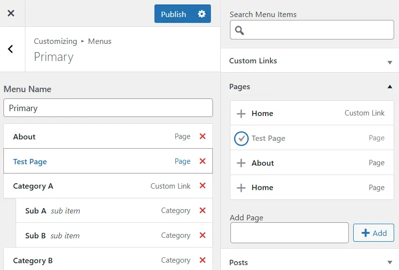 이어서 Appearance – Customize의 Menu로 와서 원하는 곳에 방금 만든 페이지를 추가하고 저장하면 적용할 수 있다.