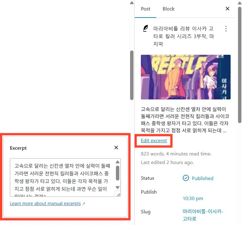 블록 에디터를 기준으로 화면 오른쪽 썸네일 아래 보이는 Edit excerpt를 클릭하면 원하는 문구를 넣을 수 있다. Excerpt는 대략 100자 전후면 무난해 보이는데 너무 짧으면 임팩트가 없고 반대로 너무 길면 글자가 잘려서 다 보이지 않는다.