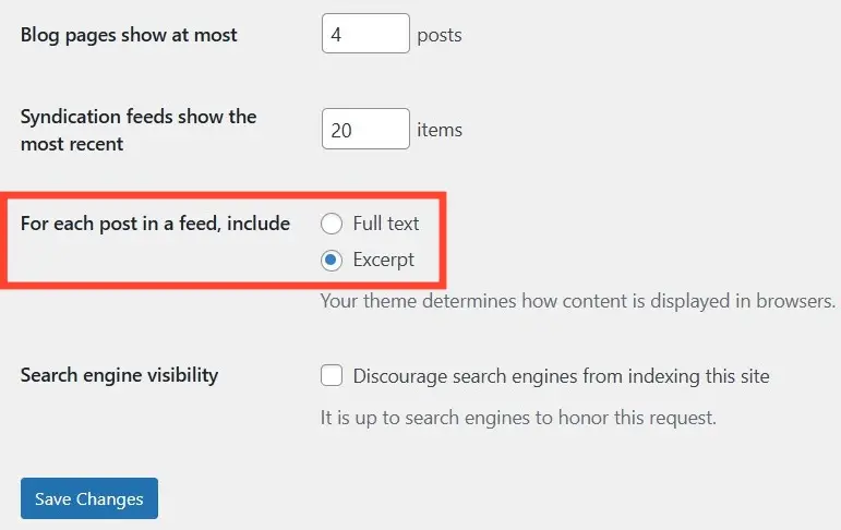 만약 전체 글이 설명문으로 나온다면 워드프레스 설정 화면 왼쪽 메뉴 Settings – Reading으로 와서 Excerpt를 선택하면 된다.