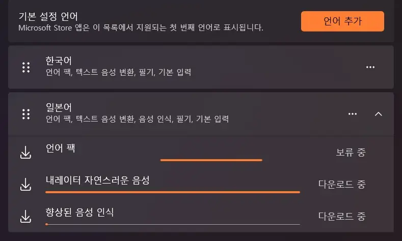 일본어 검색 후 설치를 진행하면 언어 팩이 자동 인스톨되는데 약 30초 정도 지나서 완료된다.