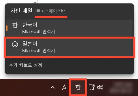 혹은 키보드로 윈도우 키(🪟) + 스페이스바를 입력해도 언어 창이 나오는데, 스페이스바를 더 눌러서 일본어를 선택하면 된다.
