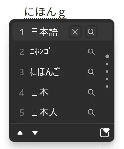 이때 입력하는 글자 바로 아래 작은 창이 나오면서 연관된 글자 목록이 나오는데 방향키를 아래로 움직여서 적합한 글자를 선택하면 된다. (엔터 키) 웬만한 한자어는 물론이고 ありがとうございます (감사합니다)처럼 긴 글자도 일부만 입력하면 목록에서 전체 글자를 쉽게 찾을 수 있다.