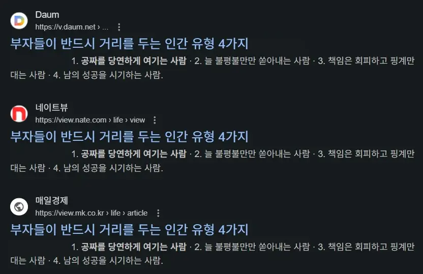 이번에는 삶의 지혜를 알려준다는 어떤 채널의 글 제목을 구글에 조회했는데 겹치지 않는 글을 찾을 수 없었다. 중복이 많을 때는 5~6곳 정도 사이트나 블로그에 같은 내용/사진이 포함된 글도 있었다.