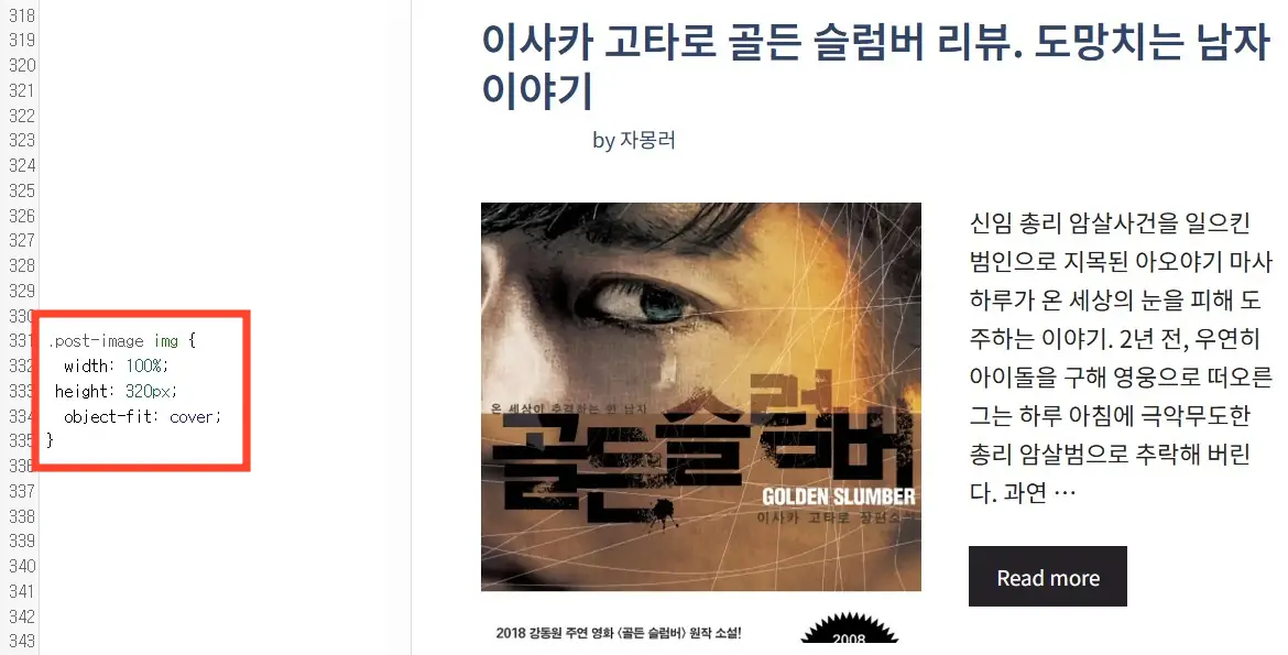 이렇게 이동한 다음, 빈 곳에 위의 코드를 넣으면 썸네일 이미지가 정사각형으로 나오는데 여기서 object-fit: cover;을 넣지 않으면 이미지 전체가 세로 사이즈에 맞게 억지로 늘어나서 찐빵처럼 나오니 주의하자.