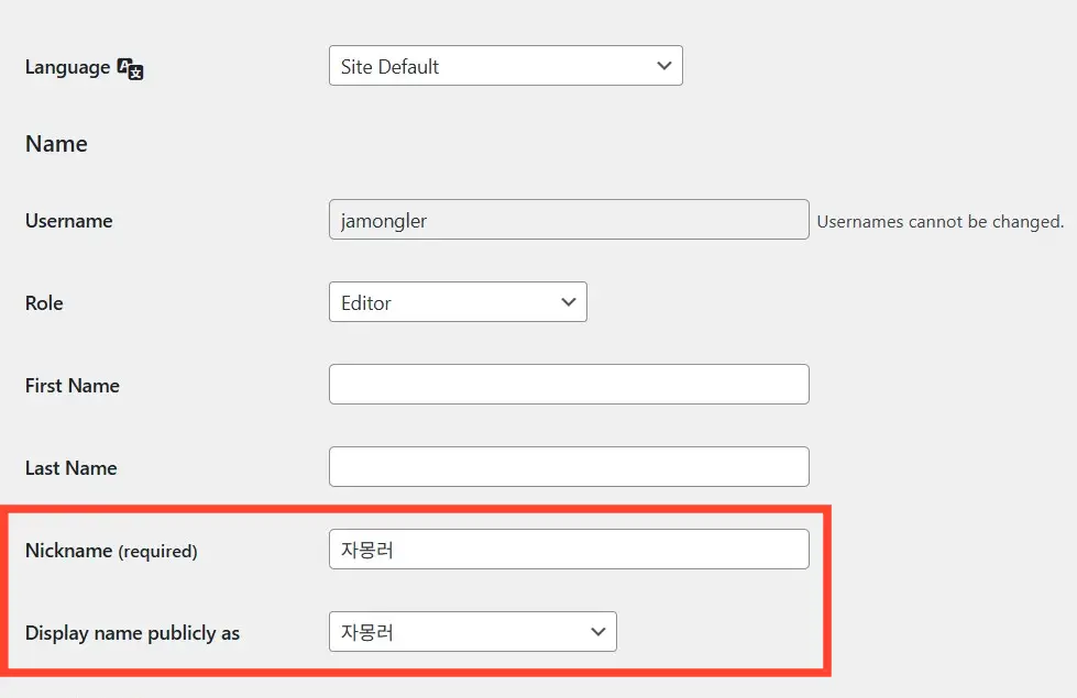 이름을 넣고, Display name publicly as란에도 해당 닉네임을 선택하면 방문자에게도 그대로 보인다. 이후 화면 맨 아래 Update Profile 버튼을 눌러서 저장하면 완료이다.