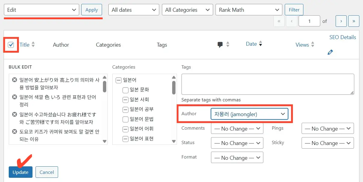 대시보드 – All Posts – 왼쪽 위 체크 박스 – Edit Apply – Author 변경 – Update 버튼 클릭