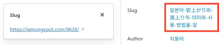 Slug 문자는 글쓰기 화면으로 오면 글 제목 그대로 생성된 것을 볼 수 있다. 문자 퍼머링크 설정 상태에서는 Slug의 글자를 직접 클릭해서 수정할 수 있는데, 숫자 퍼머링크에서는 아무리 클릭해도 고칠 방법이 없다.