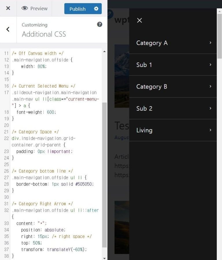 GeneratePress 오프캔버스 너비 카테고리 간격 설정 방법